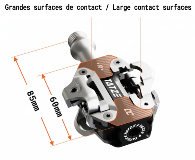 Au premier regard, la DC ou DC Titan se distingue par sa large surface d’appui. Celle-ci permet d’obtenir un meilleur contact entre la chaussure et la pédale, ce qui améliore la stabilité dans les sections techniques.