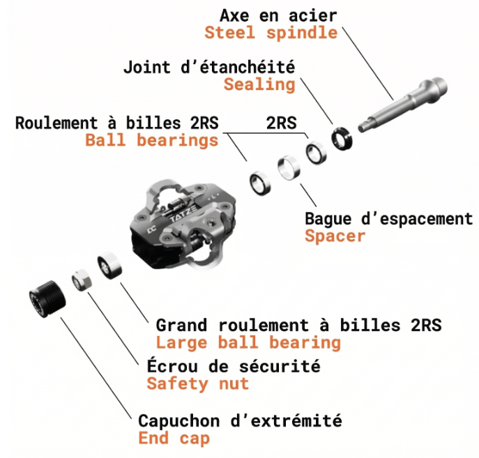 - axe en acier haute résistance ou titane pour la version TITAN